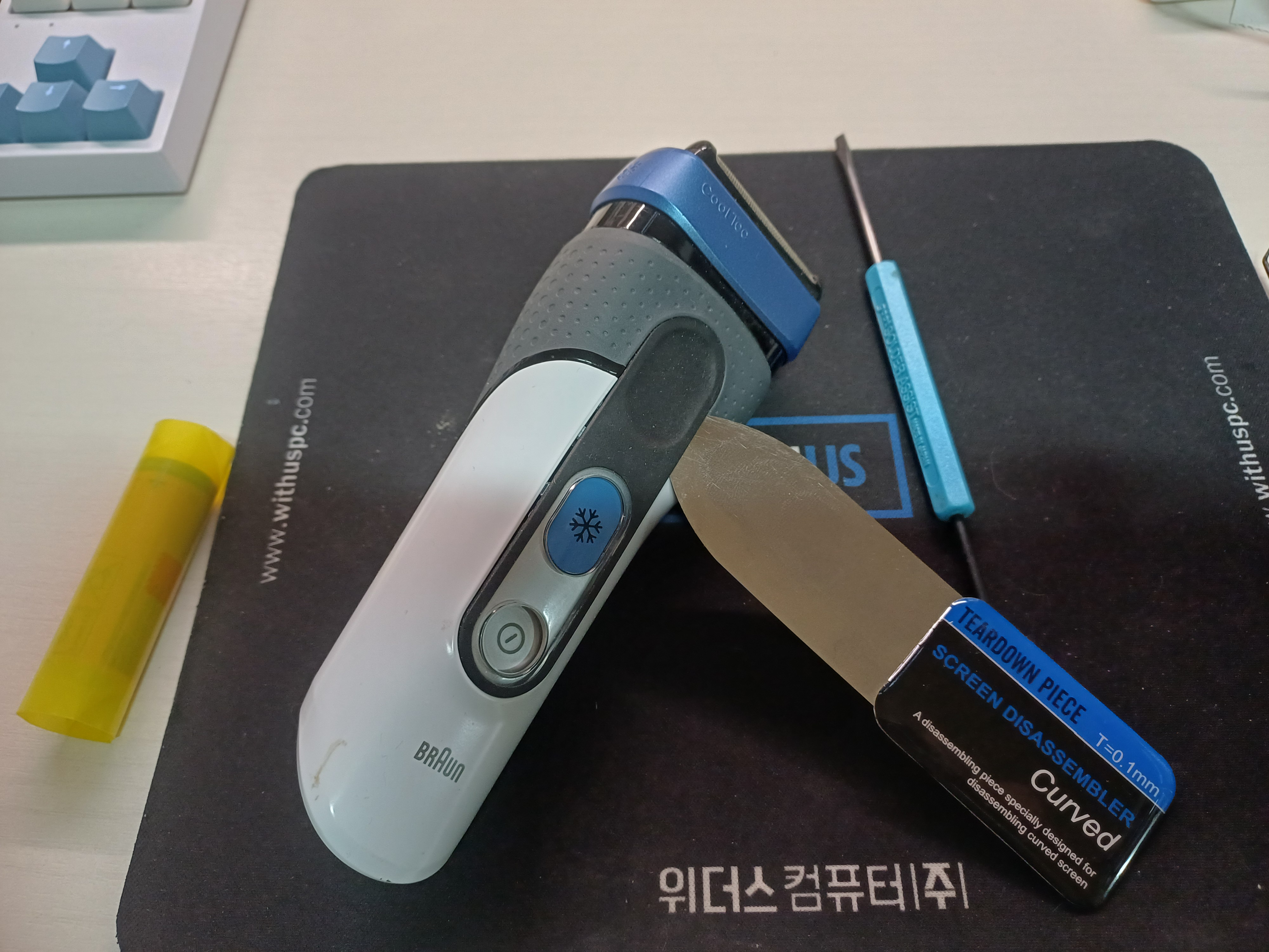 1. 헤라 와 같은 도구를 사용해서 전원 스위치가 포함된 부분을 분리합니다.