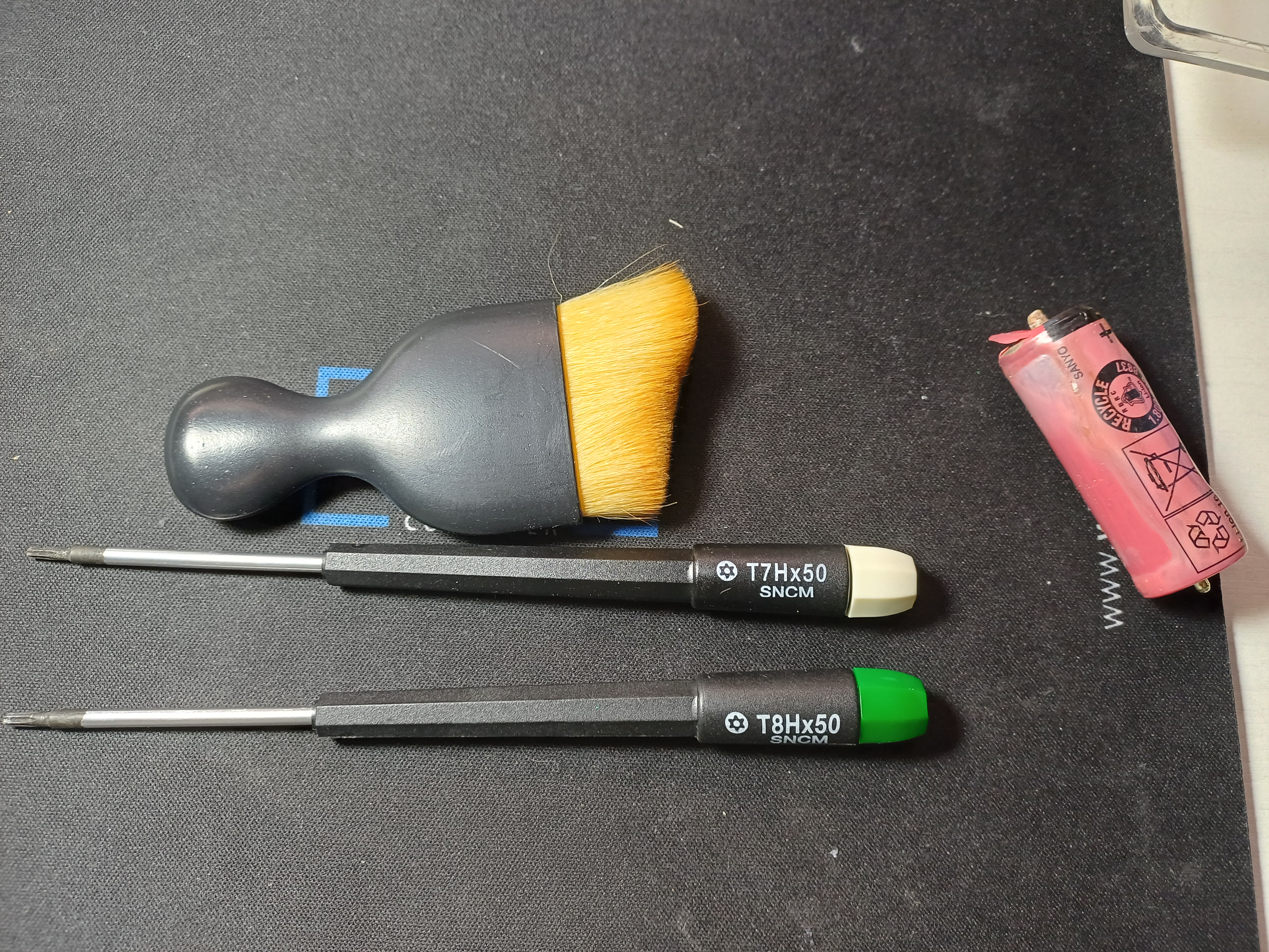 사용한 별 렌치, 솔, 탈착한 배터리(고무 테이프 뗀 자리가 그대로 남아 있음)
